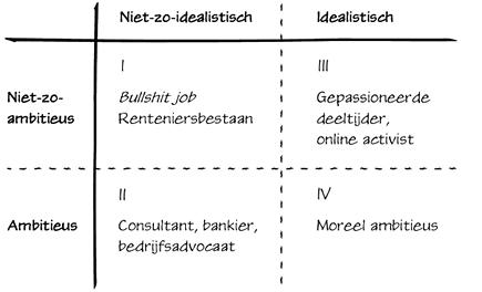- Morele Ambitie is de combinatie van Idealistisch en Ambitieus, zijn die laag heb je een bullshit job, zij ze beide hoog heb je morele ambitie